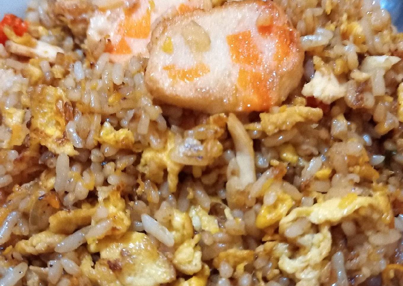 - Masukkan nasi, tumis semenit, kemudian masukkan garam, lada bubuk secukupnya, saos tiram. Masukkan juga bakso ikan dan wortel yang sudah diparut. Oseng hingga matang. Nasi goreng siap disajikan.