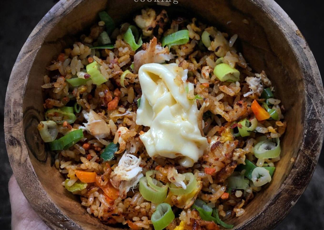 - Masukan telur ayam dan aduk masukan nasi aduk hingga rata beri kecap manis, saus tiram, saus sambal, wortel dan daun jeruk dan aduk hingga merata