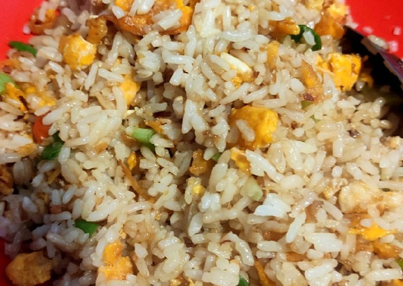 - Setelah diaduk, masukan nasi, oseng hingga telur tercampur merata, lalu tambahkan daun bawang yang telah diiris, oseng kemudian, tambahkan garam dan kaldu, koreksi rasa