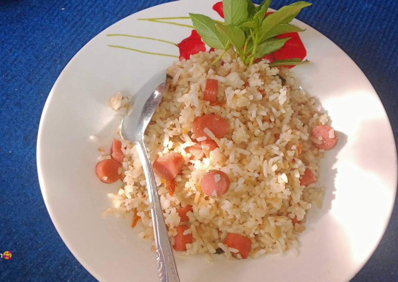 - Panaskan minyak,goreng bumbu uleg sampai harum masukkan nasi dan irisan sosis